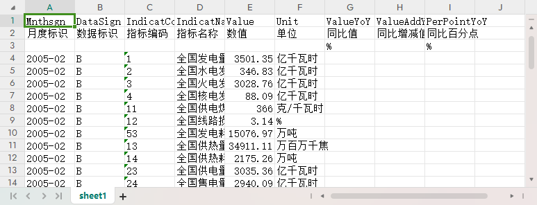 月度标识 数据标识 指标编码 指标名称 数值 单位 同比值 同比增减值 同比百分点