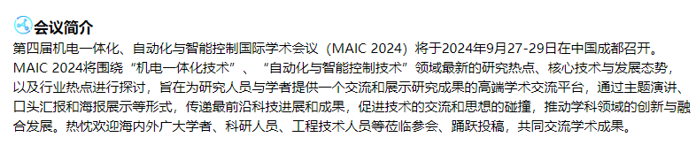 【JPCS独立出版】第四届机电一体化、自动化与智能控制国际学术会议(MAIC 2024)