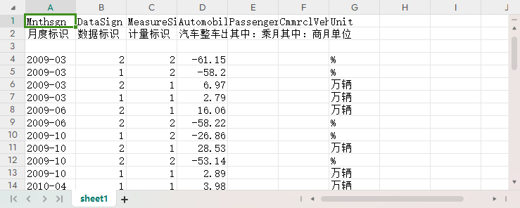 月度标识 数据标识 计量标识 汽车整车出口 其中:乘用车出口 其中:商用车出口 单位