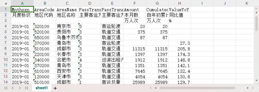 月度标识 地区代码 地区名称 主要客运方式编码 主要客运方式 本月数 自年初累计数 同比值