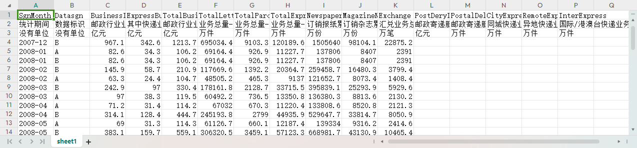 统计期间 数据标识 邮政行业业务收入 其中快递业务收入 邮政行业业务总量 业务总量-函件 业务总量-包裹 业务总量-快递 订销报纸累计数 订销杂志累计数 汇兑业务总量 邮政寄递服务业务收入 邮政寄递服务业务总量 同城快递业务量 异地快递业务量 国际/港澳台快递业务量
