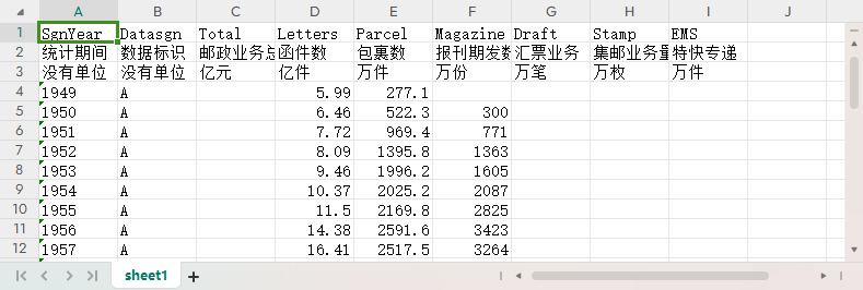 统计期间        数据标识        邮政业务总量        函件数        包裹数        报刊期发数        汇票业务        集邮业务量        特快专递
