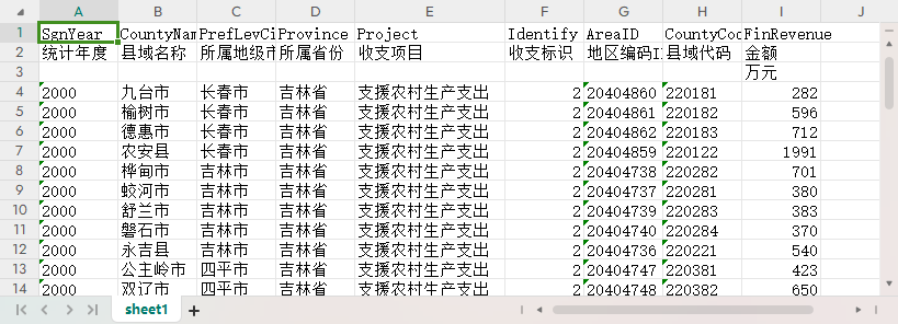 统计年度 县域名称 所属地级市 所属省份 收支项目 收支标识 地区编码ID 县域代码 金额