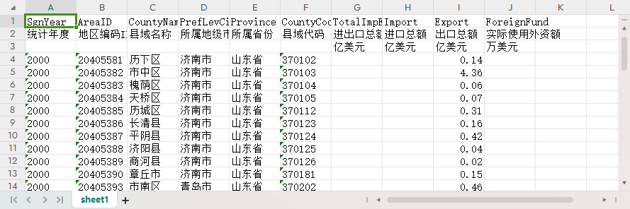 统计年度 地区编码ID 县域名称 所属地级市 所属省份 县域代码 进出口总额 进口总额 出口总额 实际使用外资额