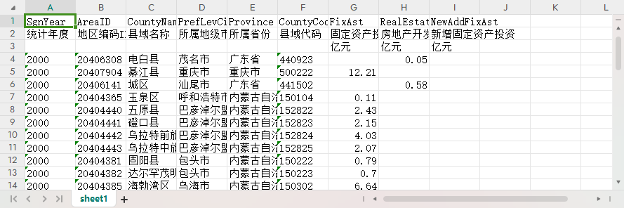 统计年度 地区编码ID 县域名称 所属地级市 所属省份 县域代码 固定资产投资 房地产开发投资 新增固定资产投资