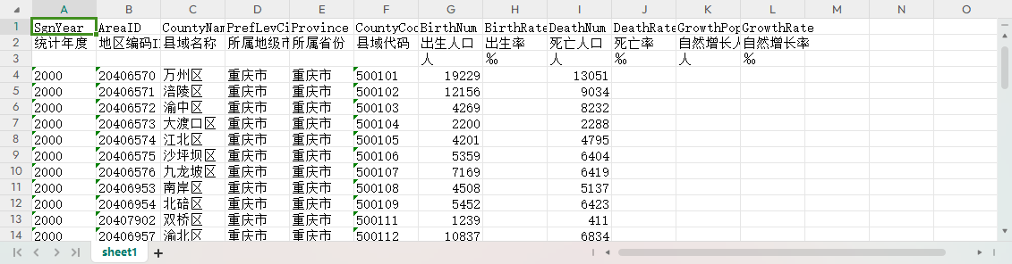 统计年度 地区编码ID 县域名称 所属地级市 所属省份 县域代码 出生人口 出生率 死亡人口 死亡率 自然增长人口 自然增长率