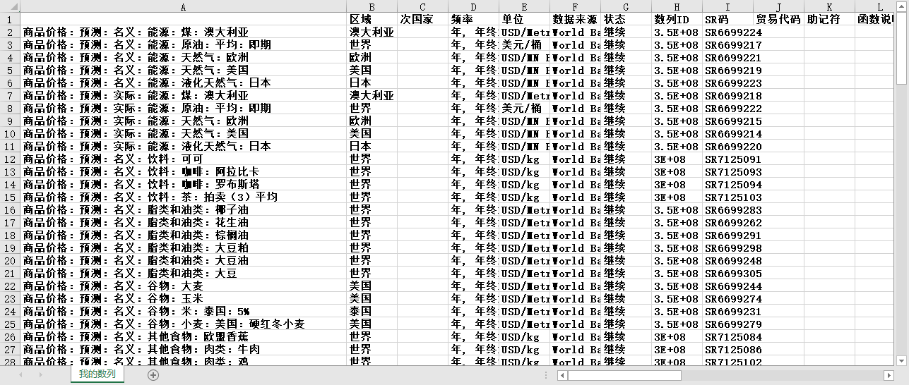 名义:能源:煤:澳大利亚 名义:能源:原油:平均:即期 名义:能源:天然气:欧洲 名义:能源:天然气:美国 名义:能源:液化天然气:日本实际:能源:煤:澳大利亚 实际:能源:原油:平均:即期 实际:能源:天然气:欧洲 实际:能源:天然气:美国 实际:能源:液化天然气:日本 名义:饮料:可可 名义:饮料:咖啡:阿拉比卡名义:饮料:咖啡:罗布斯塔 名义:饮料:茶:拍卖(3)平均 名义:脂类和油类:椰子油 名义:脂类和油类:花生油名义:脂类和油类:棕榈油 名义:脂类和油类:大豆粕 名义:脂类和油类:大豆油 名义:脂类和油类:大豆 名义:谷物:大麦 名义:谷物:玉米 名义:谷物:米:泰国:5% 名义:谷物:小麦:美国:硬红冬小麦 名义:其他食物:欧盟香蕉 名义:其他食物:肉类:牛肉 名义:其他食物:肉类:鸡 名义:其他食物:橘子名义:其他食物:虾 名义:其他食物:糖:全球 (停止更新)名义:饮料:可可 (停止更新)名义:饮料:咖啡:阿拉比卡 (停止更新)名义:饮料:咖啡:罗布斯塔 (停止更新)名义:饮料:茶:拍卖(3)平均 (停止更新)名义:其他食物:美国香蕉 (停止更新)名义:其他食物:肉类:牛肉 (停止更新)名义:其他食物:肉类:鸡(停止更新)名义:其他食物:橘子 (停止更新)名义:其他食物:虾 (停止更新)名义:其他食物:糖:全球 实际:饮料:可可 实际:饮料:咖啡:阿拉比卡 实际:饮料:咖啡:罗布斯塔实际:饮料:茶:拍卖(3)平均 实际:脂类和油类:椰子油 实际:脂类和油类:花生油 实际:脂类和油类:棕榈油 实际:脂类和油类:大豆粕实际:脂类和油类:大豆油 实际:脂类和油类:大豆 实际:谷物:大麦 实际:谷物:玉米 实际:谷物:米:泰国:5% 实际:谷物:小麦:美国:硬红冬小麦实际:其他食物:欧盟香蕉 实际:其他食物:肉类:牛肉 实际:其他食物:肉类:鸡 实际:其他食物:橘子 实际:其他食物:虾 实际:其他食物:糖:全球 (停止更新)实际:饮料:可可(停止更新)实际:饮料:咖啡:阿拉比卡 (停止更新)实际:饮料:咖啡:罗布斯塔 (停止更新)实际:饮料:茶:拍卖(3)平均(停止更新)实际:其他食物:美国香蕉 (停止更新)实际:其他食物:肉类:牛肉 (停止更新)实际:其他食物:肉类:鸡 (停止更新)实际:其他食物:橘子 (停止更新)实际:其他食物:虾(停止更新)实际:其他食物:糖:全球 名义:农业原料:日志:喀麦隆 名义:农业原料:日志:马来西亚 名义:农业原料:锯材:马来西亚 名义:农业原料:棉花A指数 名义:农业原料:橡胶:马来西亚 名义:农业原料:烟草 名义:肥料:磷酸二铵 名义:肥料:磷矿 名义:肥料:氯化钾 名义:肥料:TSP 名义:肥料:尿素 (停止更新)名义:农业原料:棉花A指数 (停止更新)名义:农业原料:橡胶:马来西亚实际:农业原料:日志:喀麦隆 实际:农业原料:日志:马来西亚 实际:农业原料:锯材:马来西亚 实际:农业原料:棉花A指数实际:农业原料:橡胶:马来西亚 实际:农业原料:烟草 实际:肥料:磷酸二铵 实际:肥料:磷矿 实际:肥料:氯化钾 实际:肥料:TSP 实际:肥料:尿素 (停止更新)实际:农业原料:棉花A指数 (停止更新)实际:农业原料:橡胶:马来西亚名义:金属及矿物:铝 名义:金属及矿物:铜 名义:金属及矿物:铁矿石 名义:金属及矿物:铅 名义:金属及矿物:镍 名义:金属及矿物:锡 名义:金属及矿物:锌 名义:金属及矿物:黄金名义:金属及矿物:银 名义:金属及矿物:铂 (停止更新)名义:金属及矿物:铁矿石 (停止更新)名义:金属及矿物:铅 (停止更新)名义:金属及矿物:锡 (停止更新)名义:金属及矿物:锌(停止更新)名义:金属及矿物:银 实际:金属及矿物:铝 实际:金属及矿物:铜 实际:金属及矿物:铁矿石 实际:金属及矿物:铅 实际:金属及矿物:镍 实际:金属及矿物:锡实际:金属及矿物:锌 实际:金属及矿物:黄金 实际:金属及矿物:银 实际:金属及矿物:铂