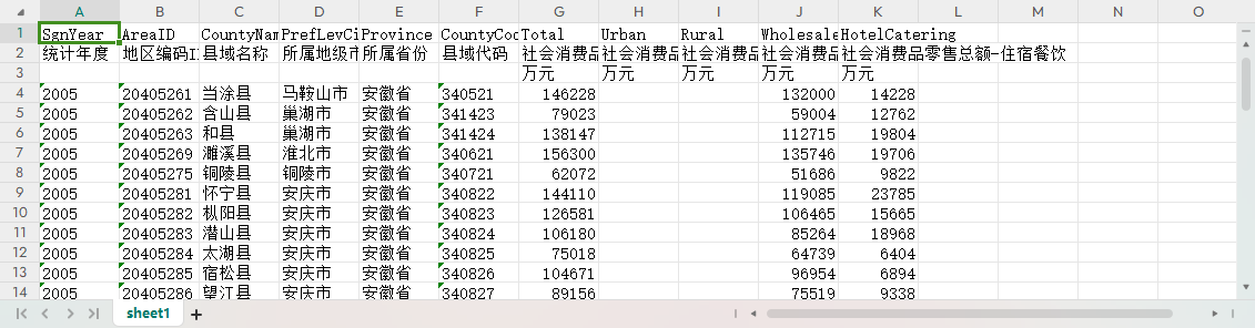 统计年度 地区编码ID 县域名称 所属地级市 所属省份 县域代码 社会消费品零售总额 社会消费品零售总额-城镇 社会消费品零售总额-乡村 社会消费品零售总额-批发零售 社会消费品零售总额-住宿餐饮