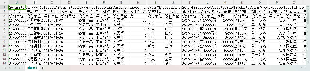 证券ID 产品名称 发行时间 公司ID 产品类型 发行机构 理财币种 投资门槛 发售对象 发行地 成立时间 发行规模 成立规模 产品期限 期限类型 预期收益率(%) 收益类型 是否保本 投资方式 投资领域 投资管理类型 投资管理人 项目经理 资金托管行 资金托管费率(%) 申购赎回费率(%) 收益分配方式 到期清算日 实际收益率(%) 交易结构 信用增级措施 产品特点 其他相关信息
