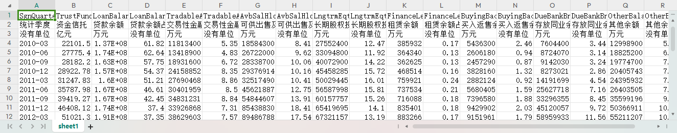 统计季度 资金信托 贷款余额 贷款余额占比(%) 交易性金融资产投资余额 交易性金融资产投资余额占比(%) 可供出售及持有至到期投资余额 可供出售及持有至到期投资余额占比(%) 长期股权投资余额 长期股权投资余额占比(%) 租赁余额 租赁余额占比(%) 买入返售余额 买入返售余额占比(%) 存放同业余额 存放同业余额占比(%) 其他余额 其他余额占比(%)