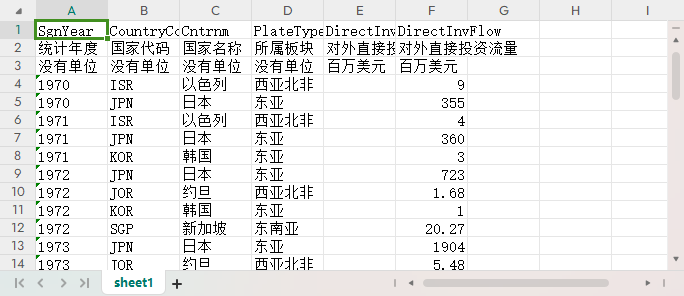 统计年度 国家代码 国家名称 所属板块 对外直接投资存量 对外直接投资流量