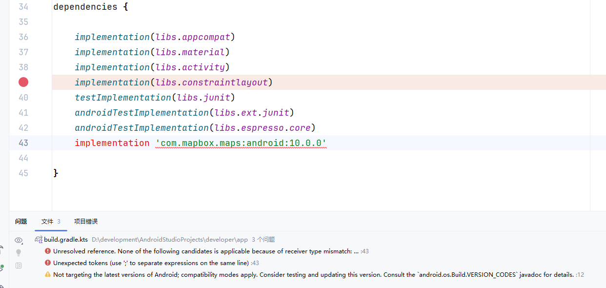 build.gradle.kts 文件中添加的 Mapbox 依赖项导致了以下几个错误: