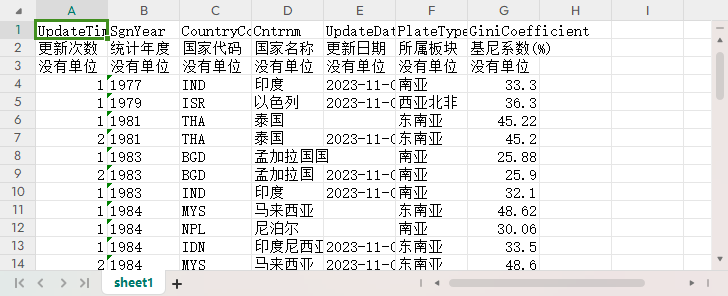 更新次数 统计年度 国家代码 国家名称 更新日期 所属板块 基尼系数(%)