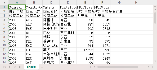 统计年度 国家代码 国家名称 所属板块 对外直接投资流量 对外直接投资存量