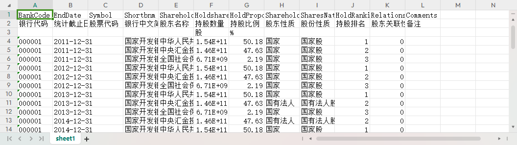 银行代码 统计截止日期 股票代码 银行中文简称 股东名称 持股数量 持股比例 股东性质 股份性质 持股排名 股东关联性 备注