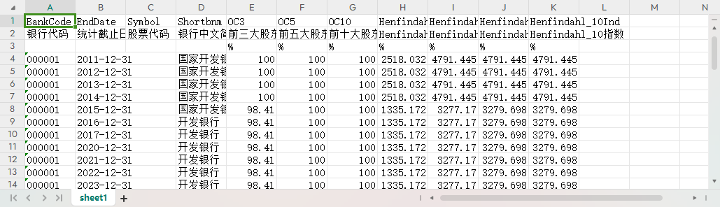 银行代码 统计截止日期 股票代码 银行中文简称 前三大股东股权集中度 前五大股东股权集中度 前十大股东股权集中度 Henfindahl指数 Henfindahl_3指数 Henfindahl_5指数 Henfindahl_10指数