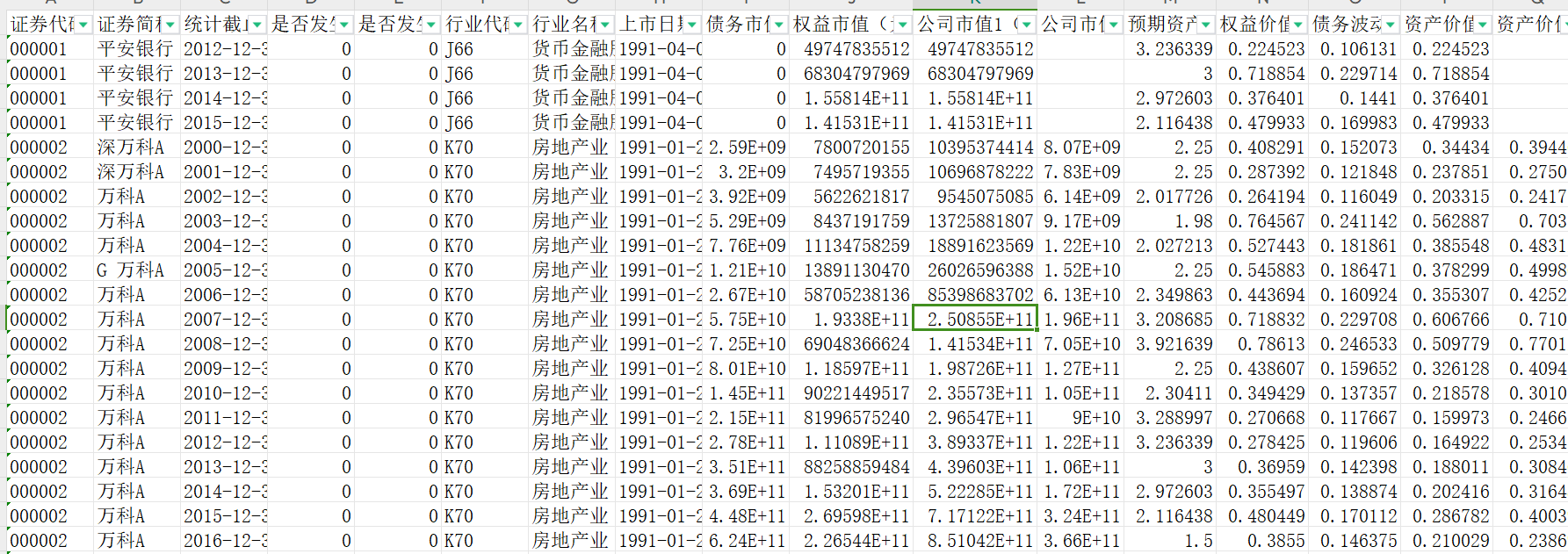 3、指标:证券代码、证券简称、统计截止日期、是否发生ST或*ST或PT、是否发生暂停上市、行业代码、行业名称、上市日期、债务市值(元)、权益市值(元)、公司市值1(元)、公司市值2(元)、预期资产收益率、权益价值波动性、债务波动性、资产价值波动性1、资产价值波动性2、当年实际交易天数(天)、DD_Bhsh、DD_merton、DD_KMV