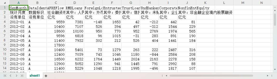 统计月度 数据标识 社会融资规模增量 其中:人民币贷款 其中:外币贷款(折合人民币) 其中:委托贷款 其中:信托贷款 其中:未贴现银行承兑汇票 其中:企业债券 其中:非金融企业境内股票融资