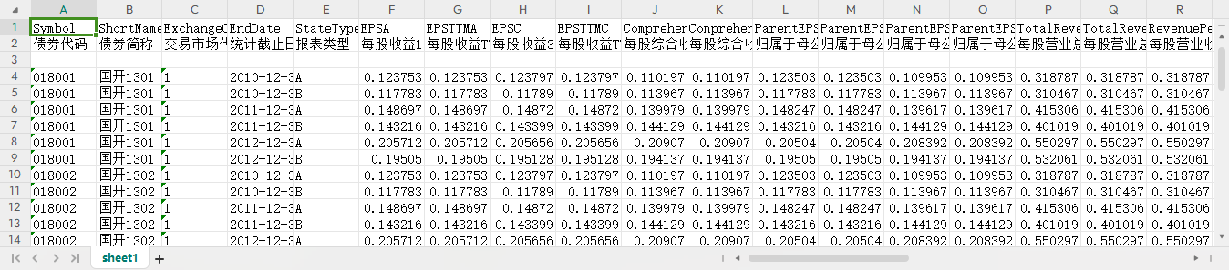 债券代码 债券简称 交易市场代码 统计截止日期 报表类型 每股收益1 每股收益TTM1 每股收益3 每股收益TTM3 每股综合收益1 每股综合收益TTM1 归属于母公司每股收益1 归属于母公司每股收益TTM1 归属于母公司每股综合收益1 归属于母公司每股综合收益TTM1 每股营业总收入1 每股营业总收入TTM1 每股营业收入1 每股营业收入TTM1 息税前每股收益1 息税前每股收益TTM1 息税折旧摊销前每股收益1 息税折旧摊销前每股收益TTM1 每股营业利润1 每股营业利润TTM1 每股净资产1 每股有形资产1 每股负债1 每股资本公积1 每股盈余公积1 每股未分配利润1 每股留存收益1 归属于母公司每股净资产1 每股经营活动产生的现金流量净额1 每股经营活动产生的现金流量净额TTM1 每股投资活动现金净流量1 每股投资活动现金净流量TTM1 每股筹资活动现金净流量1 每股筹资活动现金净流量TTM1 每股企业自由现金流量1 每股企业自由现金流量TTM1 每股股东自由现金流量1 每股股东自由现金流量TTM1 每股股东自由现金流量3 每股折旧和摊销1 每股折旧和摊销TTM1 每股现金净流量1 每股现金净流量TTM1