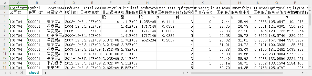 公司ID 股票代码 股票简称 统计截止日期 股本总数 非流通股股数 流通股股数 国有限售股数量 国有限售股占比 股权结构多样性 是否存在混合股权结构 非国有股东持股比例之和 股权集中度 非国有股东参股程度 股权制衡度 股权融合度 股权结构的赫芬达尔指数 股权结构熵指数