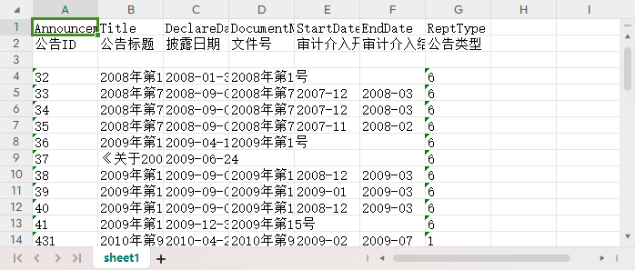 公告ID 公告标题 披露日期 文件号 审计介入开始时间 审计介入结束时间 公告类型