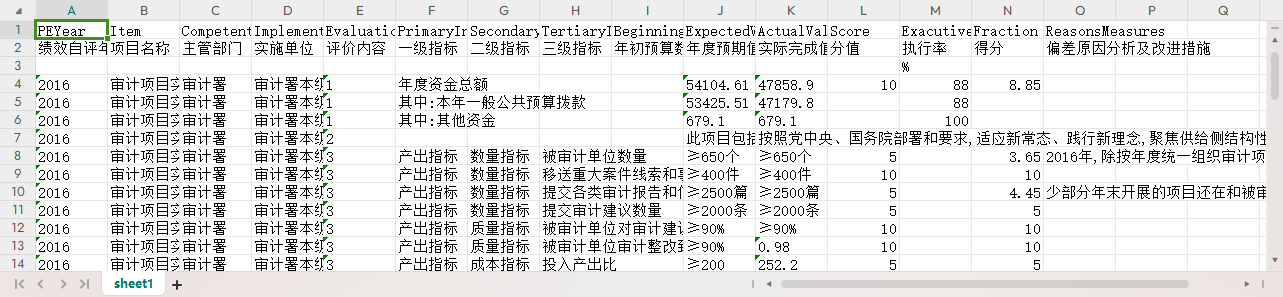 ActualValue [实际完成值] - 当评价内容为“项目资金”时,实际完成值对应的指标内容为“全年执行数”;当评价内容为“年度总体目标”时,实际完成值对应的指标内容为“实际完成情况”;当评价内容为“绩效指标”时,实际完成值对应的指标内容为“实际完成值”。