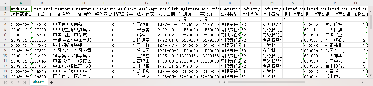统计截止日期 央企公司ID 央企全称 央企简称 整体是否上市 监管分类 法人代表 成立日期 注册资本 实缴资本 公司类型 行业代码 行业名称 旗下上市公司数量 旗下上市公司股票代码 旗下上市公司股票简称 旗下A股公司数量 旗下A股上市公司股票代码 旗下A股上市公司股票简称 注册地址 注册地所属省份代码 注册地所属省份 注册地所属城市代码 注册地所属城市 注册地经度 注册地纬度 经营范围 统一社会信用代码