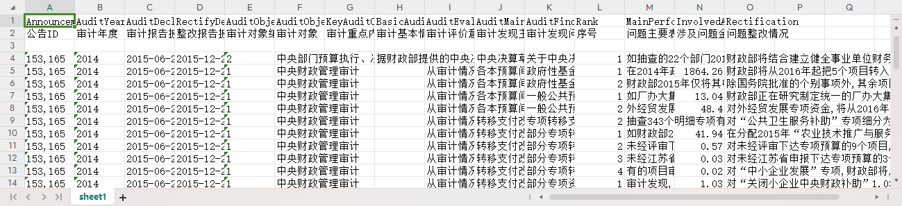 公告ID 审计年度 审计报告披露日期 整改报告披露日期 审计对象编码 审计对象 审计重点内容 审计基本情况 审计评价意见 审计发现主要问题 审计发现问题类型 序号 问题主要表现 涉及问题金额 问题整改情况