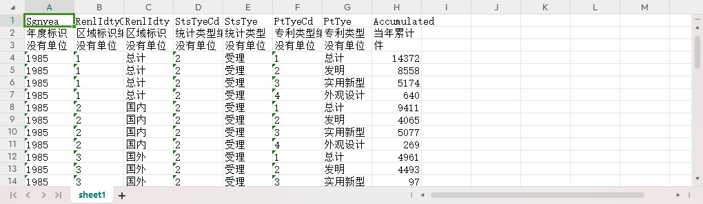 年度标识 区域标识编码 区域标识 统计类型编码 统计类型 专利类型编码 专利类型 当年累计