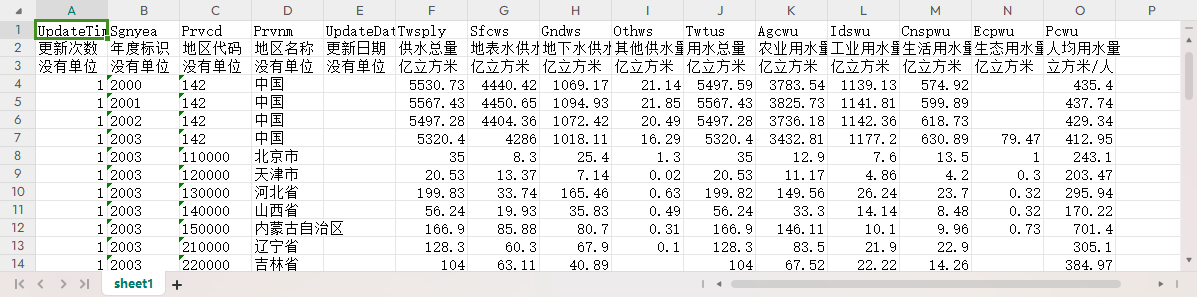 更新次数 年度标识 地区代码 地区名称 更新日期 供水总量 地表水供水量 地下水供水量 其他供水量 用水总量 农业用水量 工业用水量 生活用水量 生态用水量 人均用水量