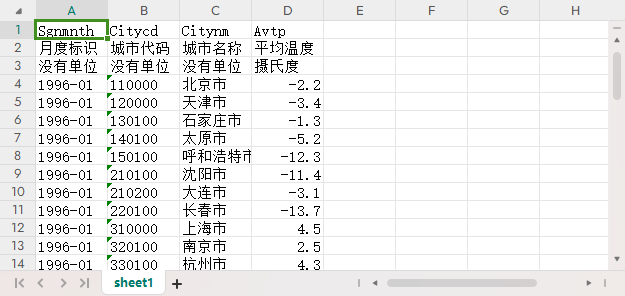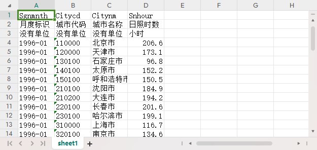 月度标识 城市代码 城市名称 平均温度 平均相对湿度(%) 日照时数