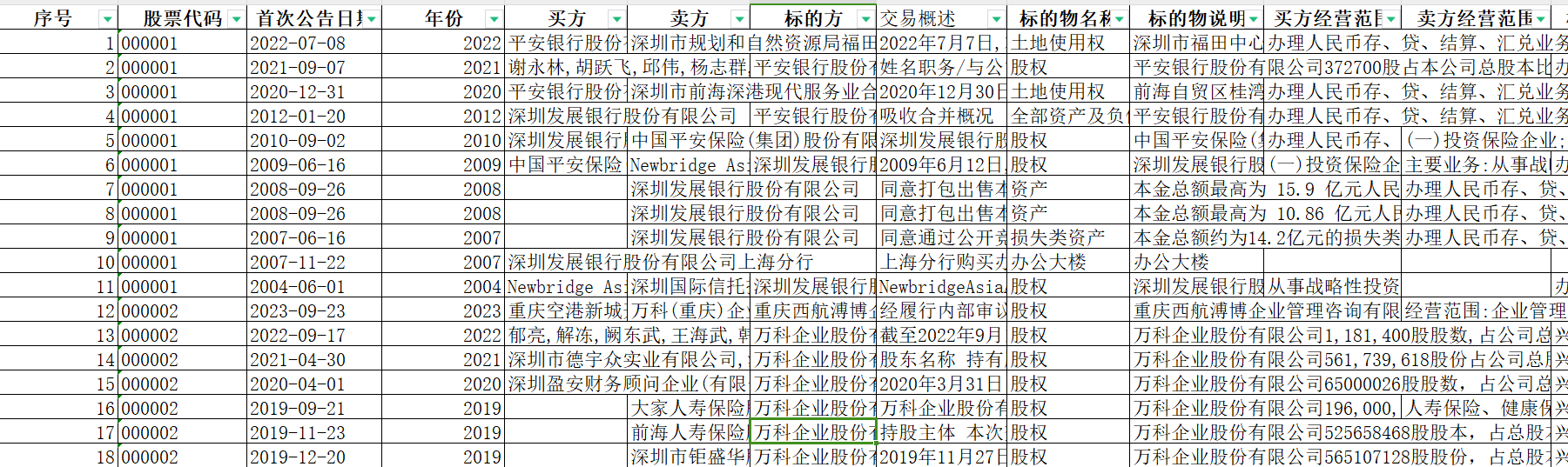 2、指标:股票代码、首次公告日期、年份、买方、卖方、标的方、交易概述、标的物名称、标的物说明、买方经营范围、卖方经营范围、标的方经营范围、是否绿色并购、绿色并购次数