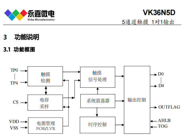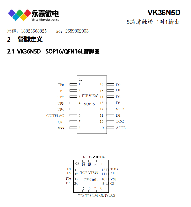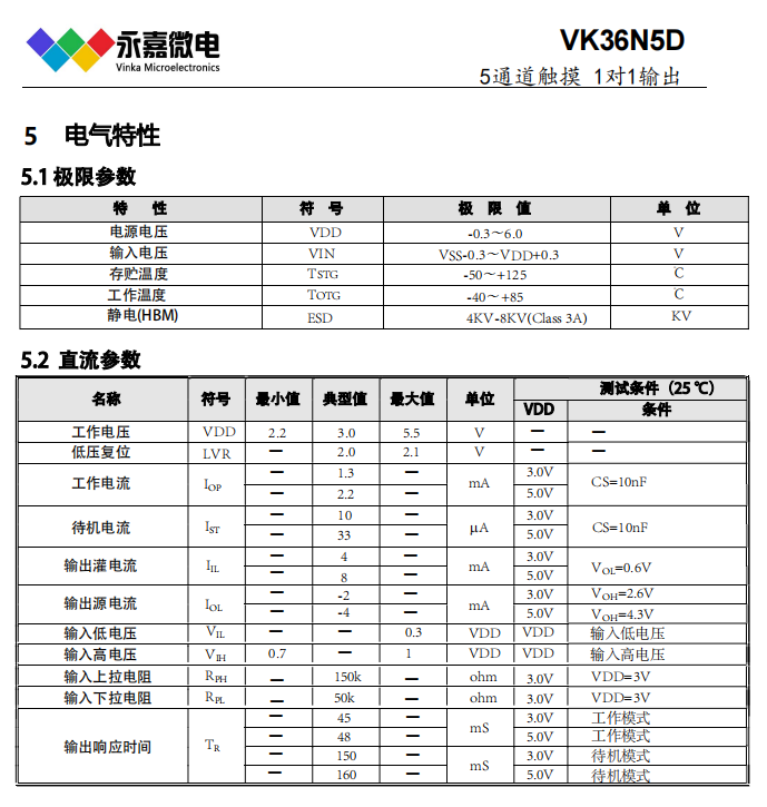VK36N5D 工作电压/待机电流:2.2V-5.5V/10μA(3V) 感应通道数:5 输出方式:直接/锁存输出