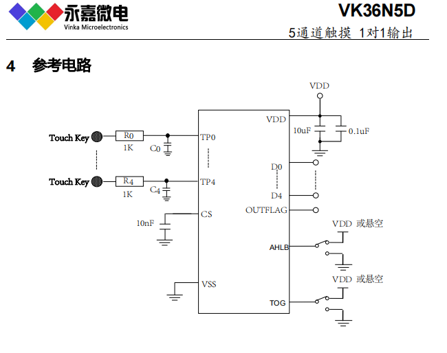 VK36N5DO 工作电压/待机电流:2.2V-5.5V/10μA(3V) 感应通道数:5 输出方式:开漏输出