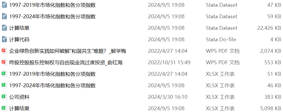 计算结果:将 “1997-2024年市场化指数”或“1997-2024年市场化总指数和各分项指数” 和“公司资料”(上市公司注册地所在省份)进行匹配之后的数据,方便大家直接使用
