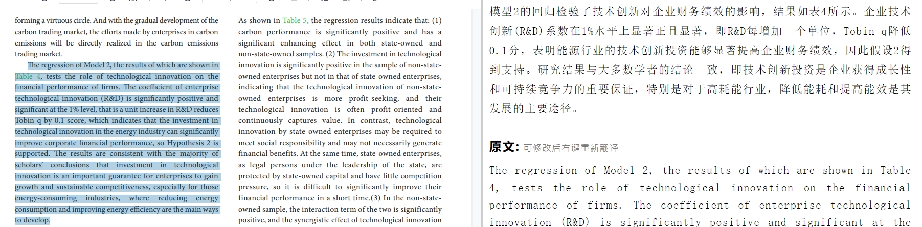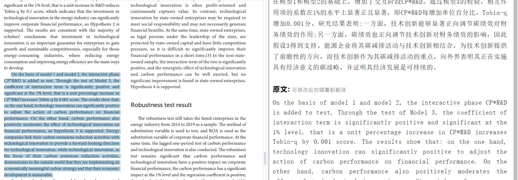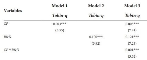 3.“CP*R&D每增加单位百分比,Tobin-q增加0.001分”,最后结论说“碳绩效和技术创新的交互作用对企业财务绩效的促进更为有效”,我的疑问是“更”体现在哪里?
