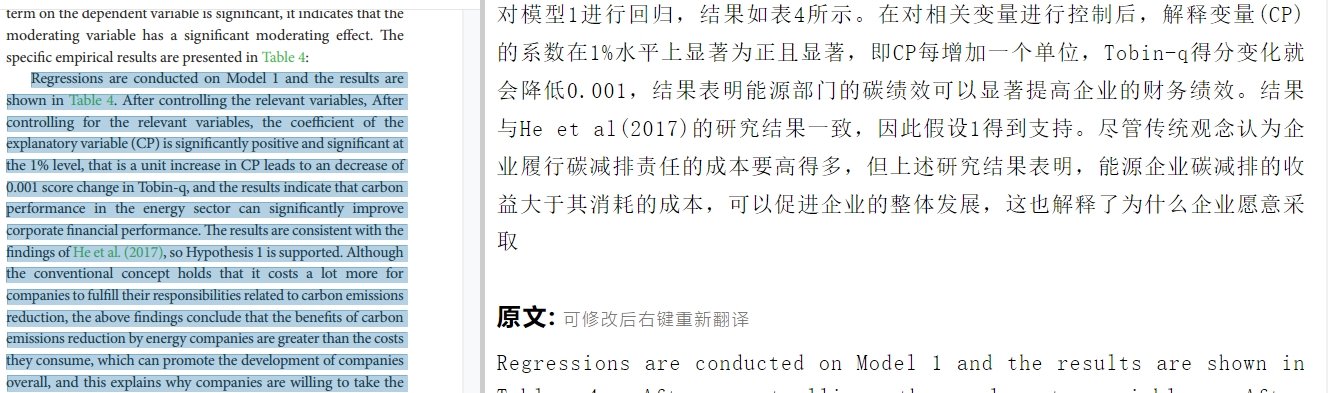 1.“解释变量(CP)的系数在1%水平上显著为正且显著,即CP每增加一个单位,Tobin-q得分变化就会降低0.001,结果表明能源部门的碳绩效可以显著提高企业的财务绩效。”我的疑问是:为什么不是增加0.003?