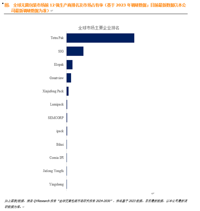 - 全球范围内,无菌包装生产商主要包括Tetra Pak、SIG、Elopak、Greatview等。这些企业在技术研发、品牌影响力、市场份额等方面具有明显优势。