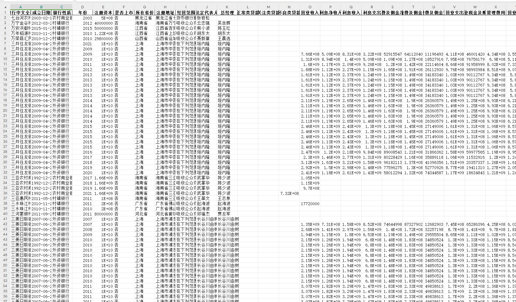 本次分享的数据为3600+银行财务数据,包括农村商业银行、村镇银行、外资银行、民营银行、股份制商业银行、城市商业银行、大型商业银行、农村合作银行、其他商业银行等。共计120个指标,银行基本信息、业务发展、财务指标、信贷资产、员工、负债等数据