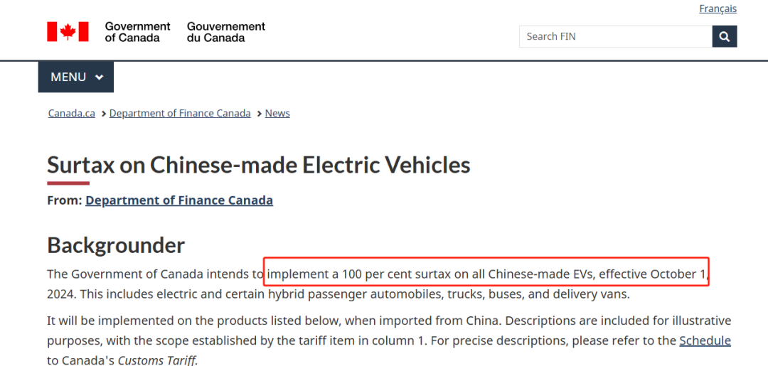 加拿大财政部表示,新的关税政策将从10月1日正式生效,适用从中国出口的所有电动汽车,包括电动和某些混合动力乘用车、卡车、公共汽车和运货车。