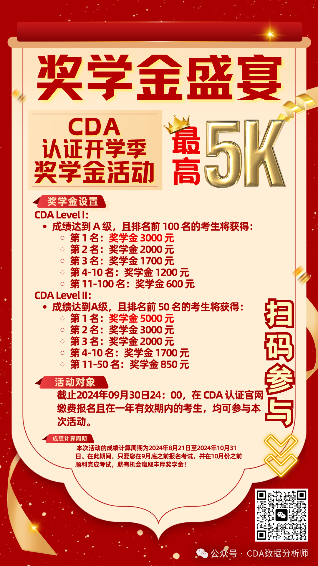 为了激励更多有志于数据分析领域的学子勇攀高峰,CDA 认证考试中心携手各授权合作伙伴,隆重推出“开学季奖学金活动”,考证有钱赚!