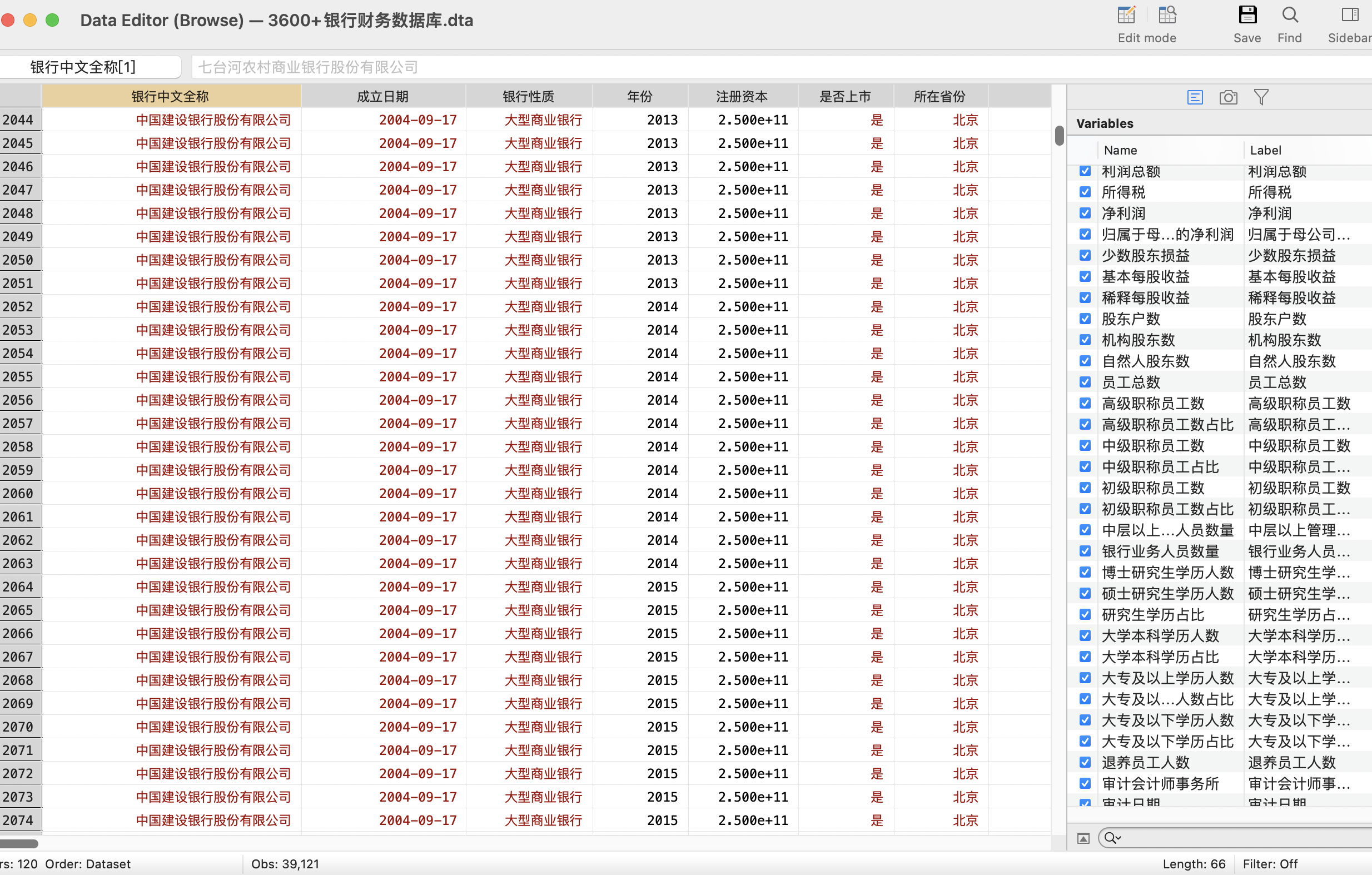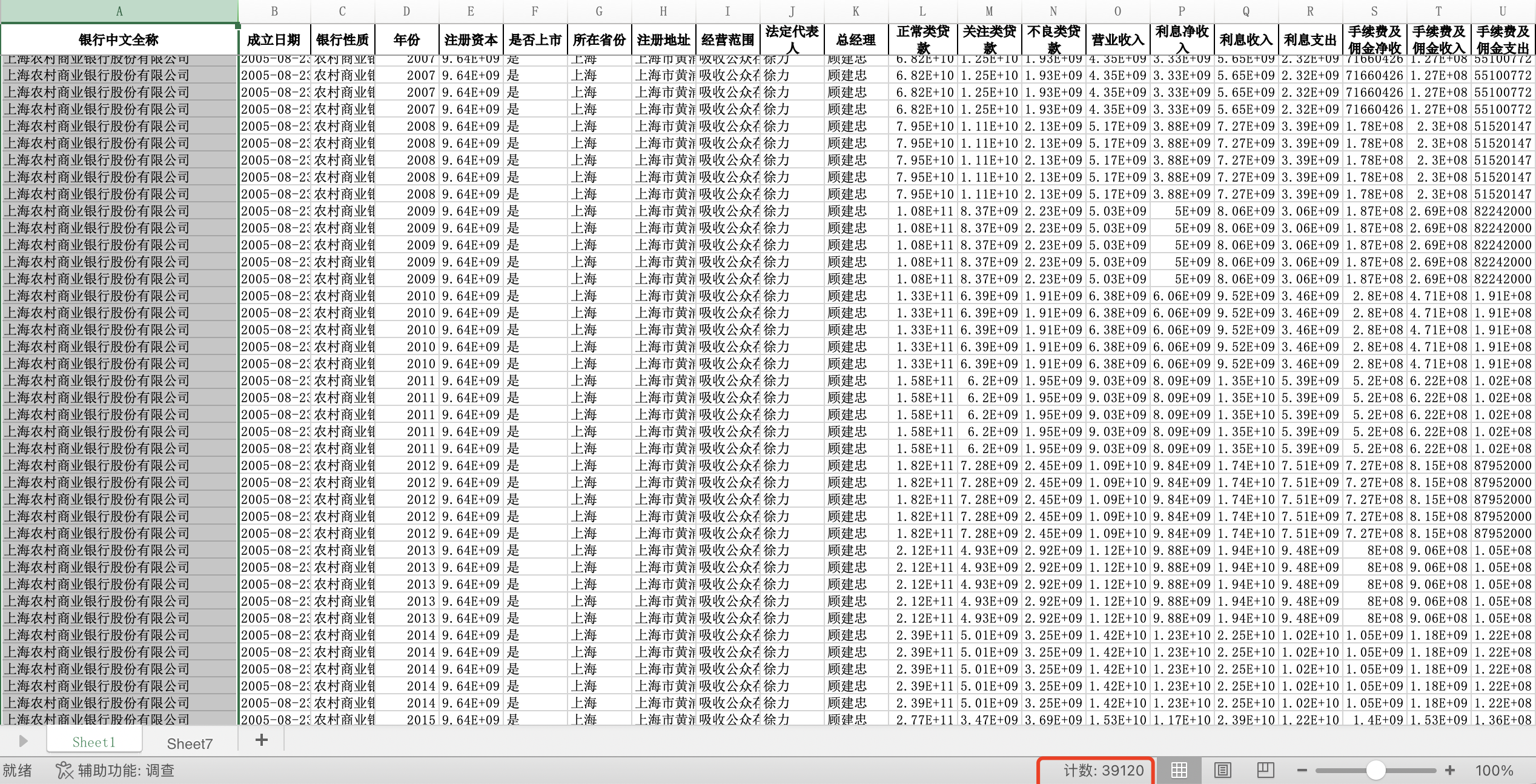 数据为包含农村商业银行、村镇银行、外资银行、民营银行、股份制商业银行、城市商业银行、大型商业银行、农村合作银行、其他商业银行等合计3620多个银行的合计120个指标,覆盖银行基本信息、业务发展、财务指标、信贷资产、员工、负债等数据。