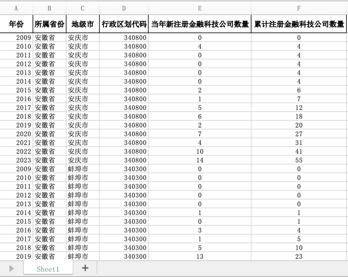 共计6个指标:年份、所属省份、地级市、行政区划代码、当年新注册金融科技公司数量、累计注册金融科技公司数量