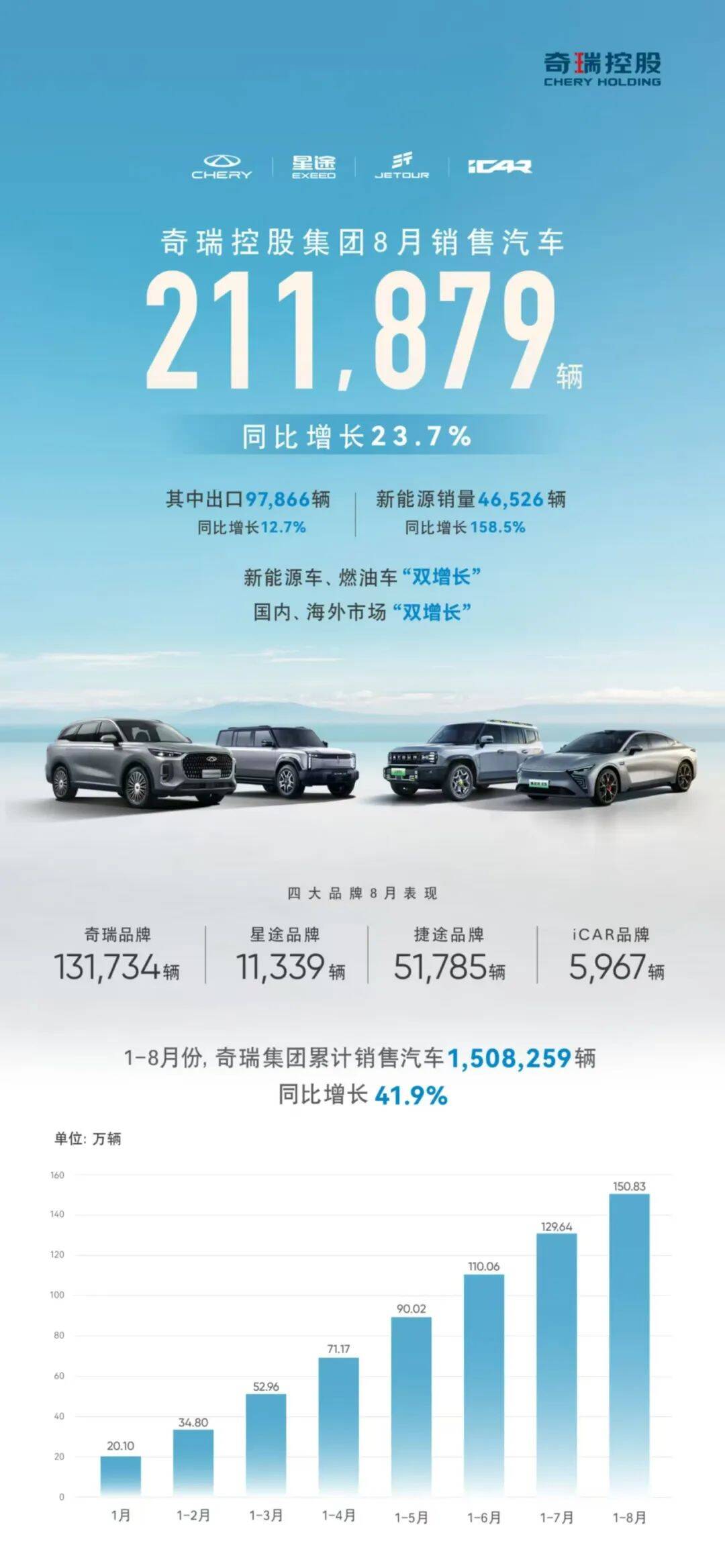 连日来,各家车企8月销量纷纷出炉,奇瑞集团交出了全行业唯一的“四增长”成绩单——国内、出口赛道“双增长”,燃油车、新能源赛道“双增长”。目前,奇瑞海外出口量已接近总销量的50%,什么成就了奇瑞连续21年位居中国乘用车品牌出口第一?