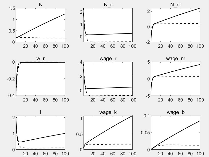 1. **参数设定问题**:检查你的模型参数是否合理。某些参数设定可能会导致经济变量在受到冲击后持续增长或保持在高水平上而不回落。例如,如果货币冲击参数设置得过高,可能会导致物价水平持续上升。重新校准这些参数可能有助于改善脉冲响应图。