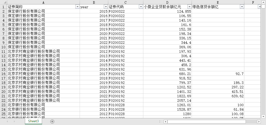 证券简称 year 证券代码 小微企业贷款余额亿元 绿色信贷余额亿