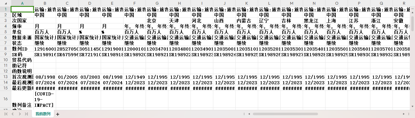 运输:旅客周转量 运输:旅客周转量:累计 运输:旅客周转量:同比 运输:旅客周转量:累计同比 运输:旅客周转量 运输:旅客周转量:北京 运输:旅客周转量:天津 运输:旅客周转量:河北 运输:旅客周转量:山西 运输:旅客周转量:内蒙古 运输:旅客周转量:辽宁 运输:旅客周转量:吉林 运输:旅客周转量:黑龙江 运输:旅客周转量:上海 运输:旅客周转量:江苏 运输:旅客周转量:浙江 运输:旅客周转量:安徽 运输:旅客周转量:福建 运输:旅客周转量:江西 运输:旅客周转量:山东 运输:旅客周转量:河南 运输:旅客周转量:湖北 运输:旅客周转量:湖南 运输:旅客周转量:广东 运输:旅客周转量:广西 运输:旅客周转量:海南 运输:旅客周转量:重庆 运输:旅客周转量:四川 运输:旅客周转量:贵州 运输:旅客周转量:云南 运输:旅客周转量:西藏 运输:旅客周转量:陕西 运输:旅客周转量:甘肃 运输:旅客周转量:青海 运输:旅客周转量:宁夏 运输:旅客周转量:新疆 运输:旅客周转量:不分地区 (DC)运输:旅客周转量:交通部