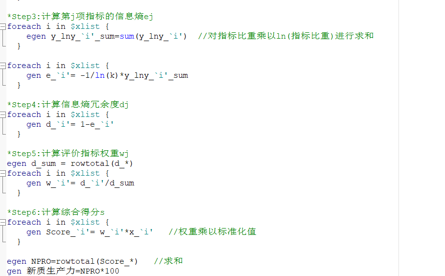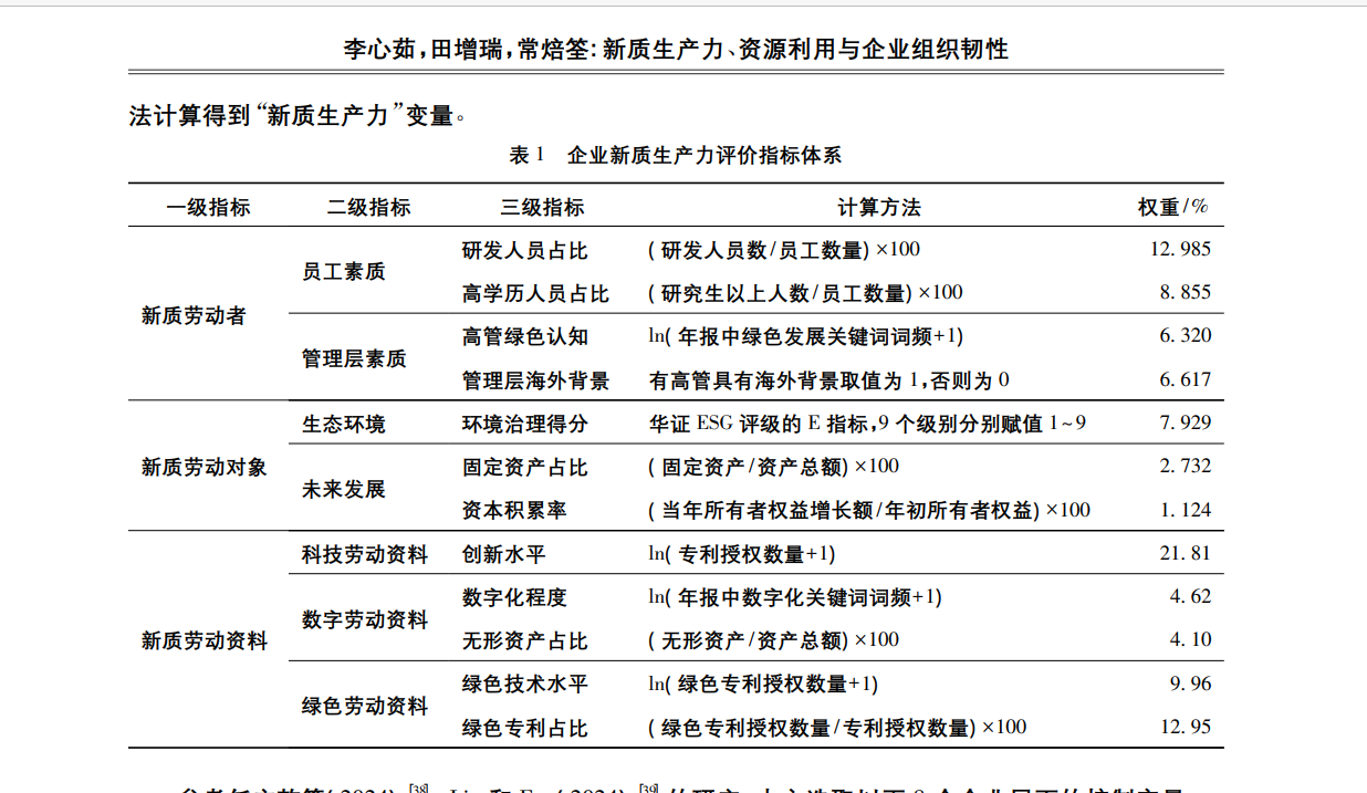 2.测算方式:参考《西部论坛》李心茹(2024)老师的做法,基于数据可获得性对其评价指标进行综合和调整,构建如表 1 所示的企业新质生产力评价指标体系,然后采用熵值法进行测算计算得到“新质生产力”变量,具体指标如下图所示