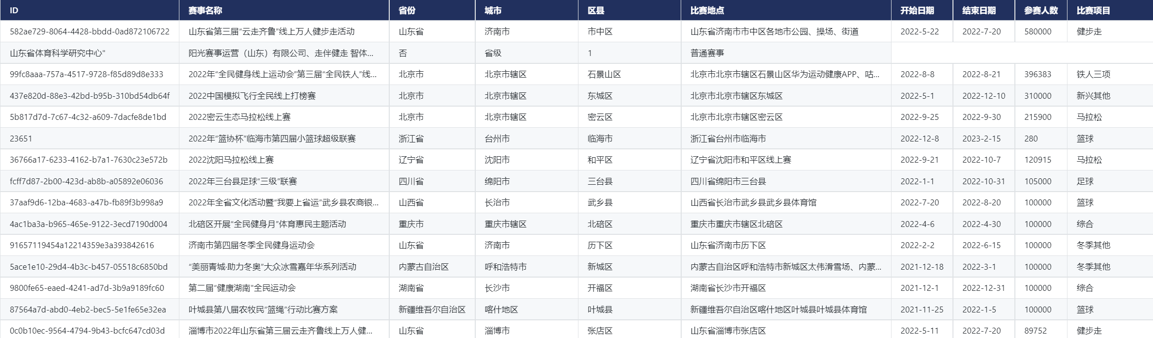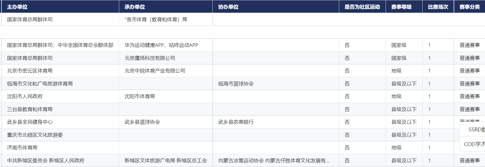 中国群众体育赛事活动信息数据,涵盖40多万条群众体育赛事活动记录,包含赛事名称、地点、开始日期、结束日期、主办单位、赛事分类等字段,为相关研究提供有力的数据支持。