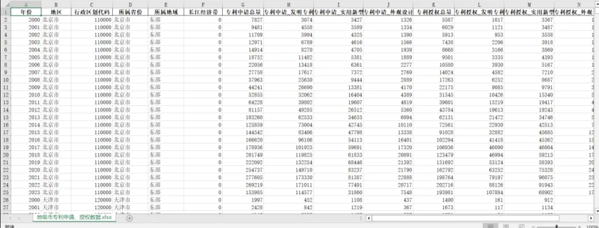 一、数据介绍数据名称:地级市专利申请、授权数据
